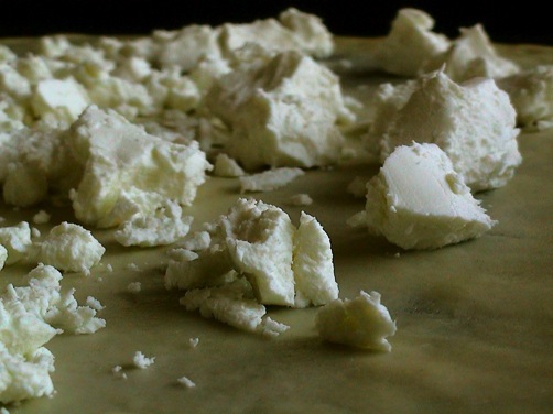Jetzt der Käse. Der wird nun auf den Teig gebröselt, wobei ein Rand zum Andrücken der oberen Teigplatte frei bleiben sollte. Diese walze ich ebenfalls dünn aus und decke damit den Käse ab. Auch das erweist sich oft als etwas aufhaltsam, weil der Teig sich störrisch wieder zusammenziehen will. Wenn er endlich sicher ringsum festgesteckt ist, muss die Focaccia noch ein wenig beackert werden. Erst einmal werden mit den Fingerspitzen ein paar Mulden eingedrückt. Dann wird alles mit ein wenig Salz bestreut. Und schließlich muss die verbliebene Hälfte des Öls aufgeträufelt werden. Es sammelt sich in den vorher eingepressten Vertiefungen. Jetzt kommt das Schönste. Mit den Handflächen wird das Öl in die Teigoberfläche einmassiert, dabei zerdrückt man sanft die Käsebrocken darunter und benetzt auch die Ränder mit Öl.